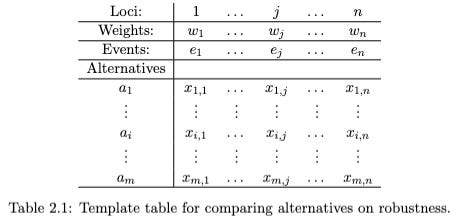 Table 2.1 just below is a template for representing decision making under uncertainty. We are comparing m alternatives, each of which is described as an ordered list (“vector”) of n numerical values.3 These are the x(i,j) values in the table. The position of a value in a vector is significant. Each vector has n loci, 1, ….., n. There are n events or scenarios. These are “things that might happen”. The x(i,j) values are scores for alternative i being chosen and scenario j occurring.
